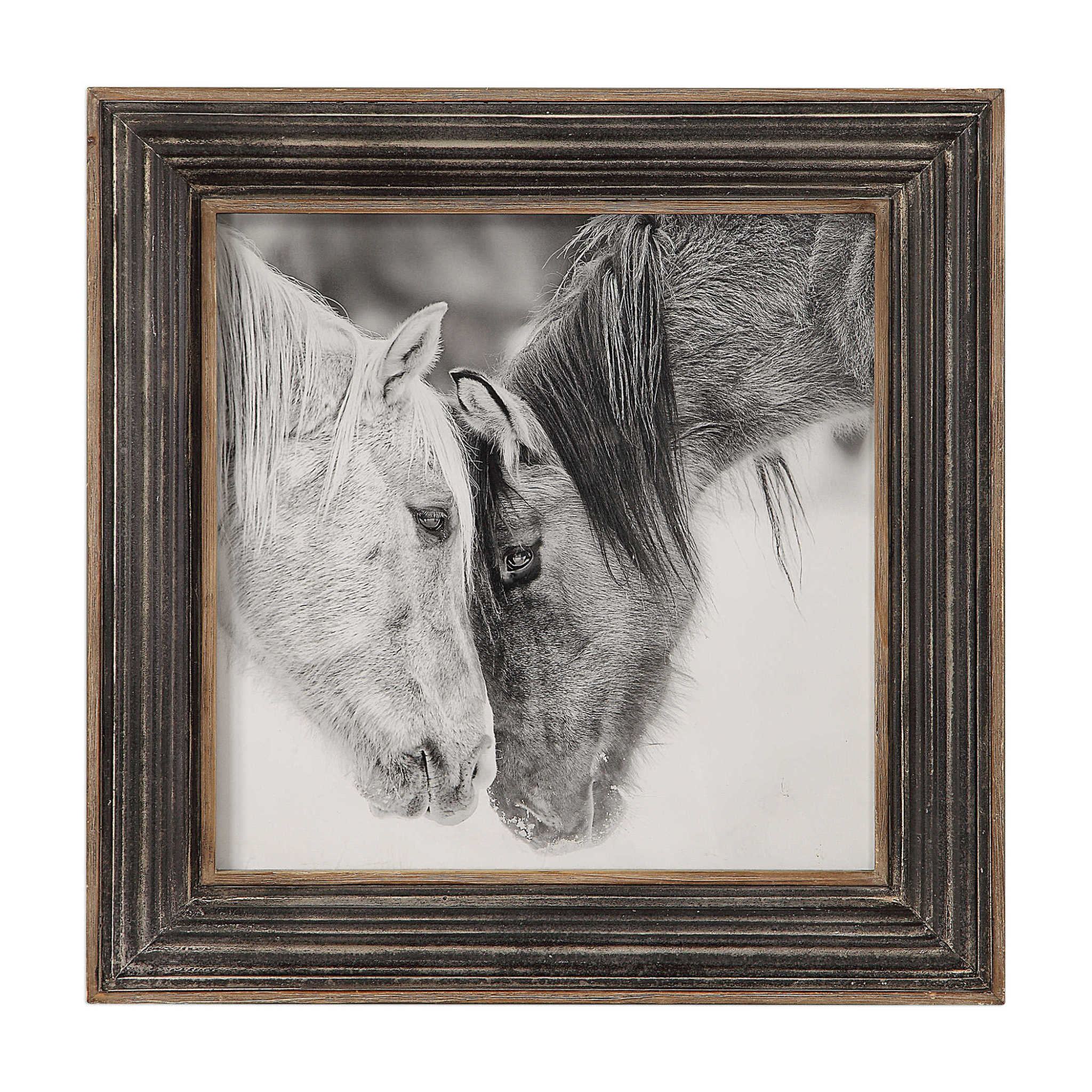 Rustic charm is added to a design with this black and white printed photograph. The transitional animal print is surrounded by a distressed wood and metal frame with corrugated style ridges. A distressed black finish and gray wash adds dimension to this p